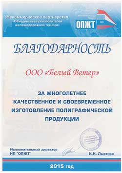 Благодарность ООО «Белый ветер» за многолетнее качественное и своевременное изготовление полиграфической продукции.
