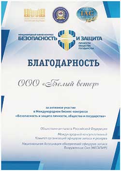 Благодарность ООО «Белый ветер» за активное участие в Международном бизнес-конгрессе «Безопасность и защита личности, общества и государства»