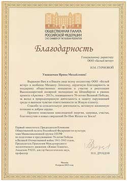 Благодарность Генеральному директору ООО «Белый ветер» И.М. Гурновой. Уважаемая Ирина Михайловна! Выражаю вам и в Вашем лице всему коллективу ООО «Белый ветер» и особенно Михаилу Лепскому, сердечную благодарность за поддержку общественных инициатив и участие в реализации Высокоширотной полярной экспедиции на Шпицберген в рамках проекта «Акетика - 2015», посвященного 70-тилетию Великой Победы, за вклад в природоохранную деятельность и защиту окружающей среды и высокое чувство ответственности за Живую планету. Спасибо за созидательную деятельность, активную жизненную позицию и доброе сердце. Примите пожелания неиссякаемой энергии, здоровья, счастья, благополучия и новых свершений Во Имя Жизни на Земле!