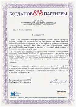 Более 15 лет компания «ПМПрофи» (товарный знак «Богданов и партнеры») работает с типографией «Белый ветер». Мы как правило, заказываем печатные материалы небольшими тиражами, но за это время их набралось несколько железнодорожный вагонов. Сам факт, что мы партнерствуем такое продолжительное время, говорит о многом. И доказывает самое главное – надежность типографии «Белый ветер». За это время нам неоднократно приходилось общаться с сотрудниками типографии Сеньковским Николаем и Гурновой Ириной. Они всегда идут навстречу заказчику, выполняя печатные работы в очень сжатые сроки и с отличным качеством. Если они обещают, то непременно выполняют обещания. Что касается соотношения «цена-качество», то оно тоже нас вполне устраивает. Выражаем руководству и сотрудникам типографии искреннюю благодарность за долгосрочное деловое сотрудничество, качественные печатные материалы и доброе, человеческое отношение к некрупному заказчику и надеемся на дальнейшее сотрудничество.