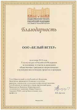Благодарность ООО «Белый ветер» по итогам 2014 года культуры в Российской Федерации за поддержку и участие в реализации общественных гражданско-патриотических и культурно-экологических проектов и программ.