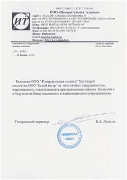 Компания ООО «Измерительная техника» благодарит коллектив ООО «Белый ветер» за многолетнее сотрудничество, оперативность, ответственность при выполнении заказов. Надеемся и будущем на Вашу надежность и взаимовыгодное сотрудничество.