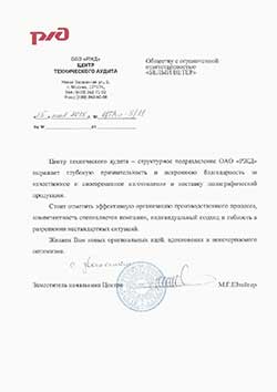 Центр-технического аудита – структурное подразделение ОАО «РЖД» выражает глубокую признательность и искреннюю благодарность ха качественное и своевременное изготовление и поставку полиграфической продукции. Стоит отметить эффективную организацию производственного процесса, компетентность специалистов компании, индивидуальный подход и гибкость в разрешении нестандартных ситуаций. Желаем Вам новых оригинальных идей, вдохновения и неисчерпаемого оптимизма.