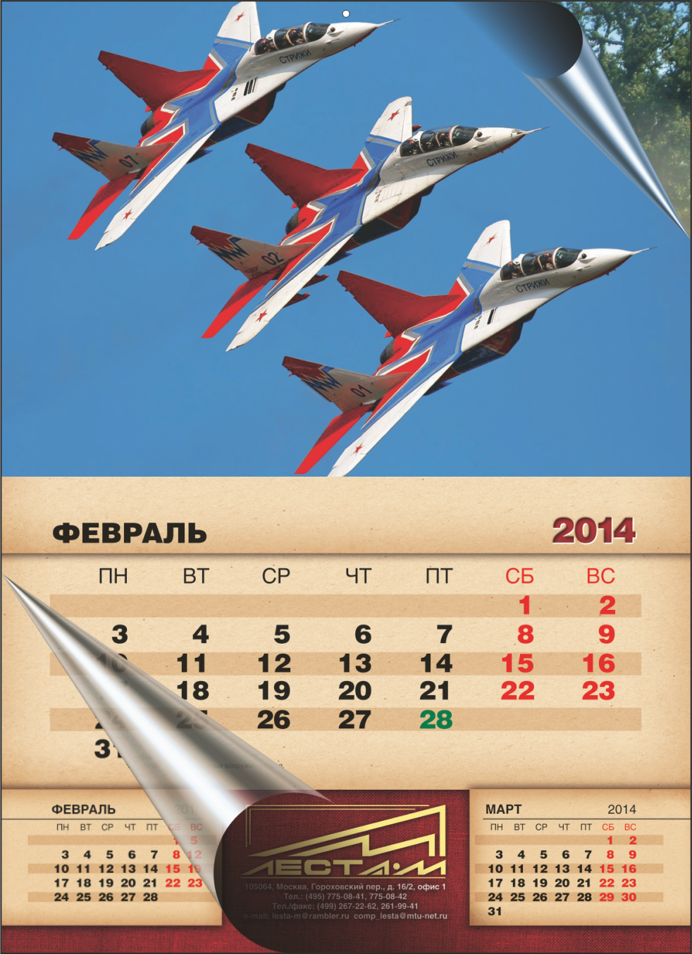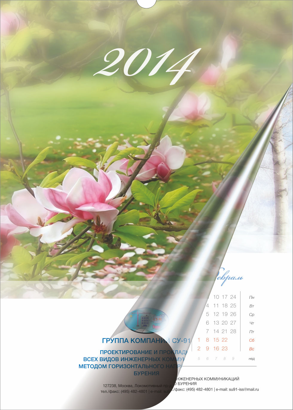 Календарь с брошюровкой посерединеНеобычный способ крепления и возможность поместить брошюрованный календарь на стене или шкафу делает его ярким и притягивающим взгляды элементом обстановки. Календари с полезной информацией и красивыми картинками отлично смотрятся в домашнем интерьере, оживляют суховатую обстановку офиса. При печати настенных календарей с брошюровкой верхнюю половину занимают постеры. Для каждого месяца подбирают своё отдельное изображение, объединённое общей темой. В нижней части настенного блокнота помещают календарную сетку с текущим, предыдущим и последующим месяцем. Календарь – брошюра по функциональным качествам ничуть не уступает квартальному календарю, но по внешнему виду и солидности значительно выигрывает у него. Цены на печать календаря формата А2 в развороте*: