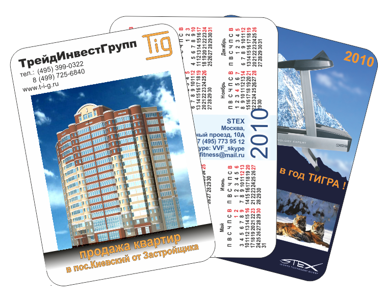 Карманные календарикиВ течение многих лет карманные календари пользуются высоким спросом как носители важной повседневной информации. Стиль и оформление подбирают в соответствии со вкусами целевой аудитории, дерзко-молодёжный, классический или мягко-винтажный, ностальгический. Печать карманных календарей осуществляется в стандартном формате, хотя по желанию заказчиков можно изменить размеры календарика. Цены на печать карманных календарей*:Полноцветные с двух сторон с глянцевой или матовой ламинацией